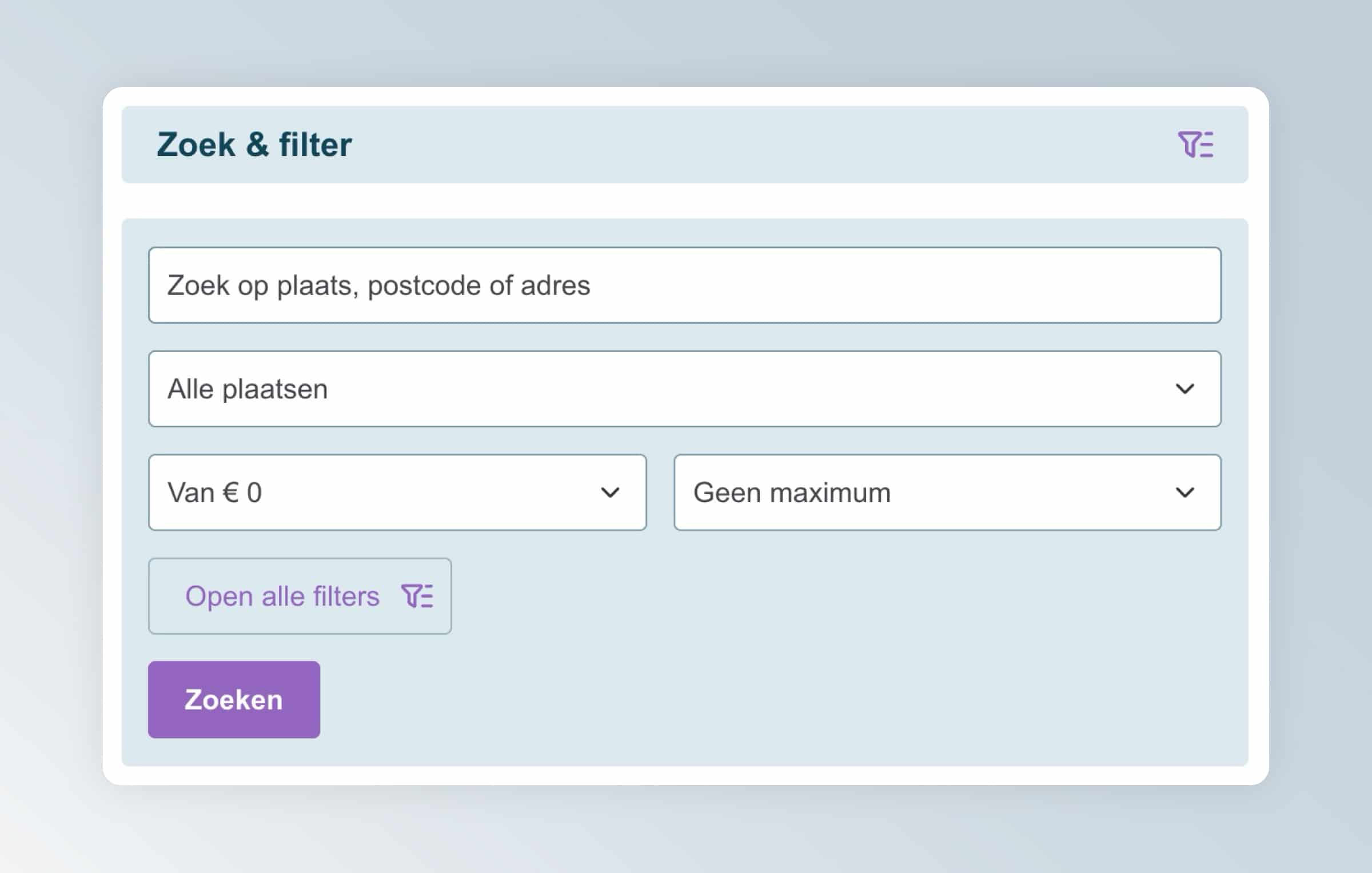 Standaard is het mogelijk om een filter en een kaart te gebruiken op de aanbodpagina. Hiervoor is al de nodige functionaliteit ingebouwd en is dus beschikbaar zonder extra meerwerk.